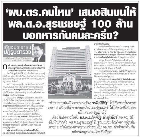 ยิ่งกรณีที่ พล.ต.อ.สุรเชชษฐ์ บอกว่า เมื่อครั้งดำรงตำแหน่ง ผบช. มี อดีต ผบ.ตร.คนหนึ่ง ซึ่งไม่รู้ตอนนั้นอยู่ในตำแหน่งหรือไม่ ได้ติดต่อมาบอกว่า อาชญากรคดีที่ตนกำลังสอบสวนอยู่เสนอเงินให้ 100 ล้านบาทเพื่อหยุดการสอบสวน ‘มึงกับกูแบ่งกันคนละครึ่ง 50 ล้าน’ แต่ได้ถูก พล.ต.อ.สุรเชชษฐ์ ปฏิเสธไป!
